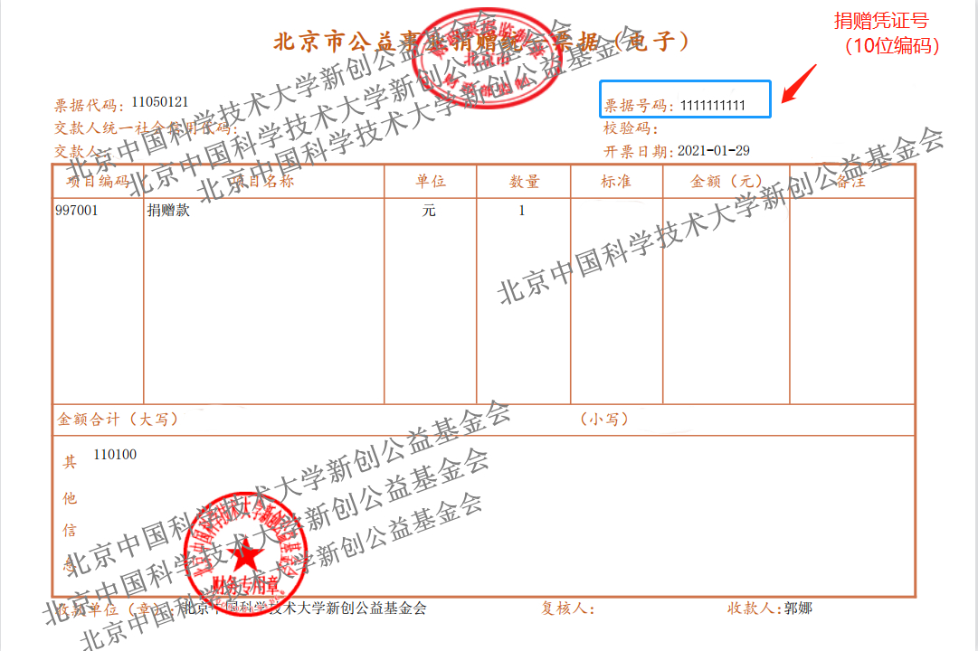 1. 捐赠凭证号:见公益性捐赠统一票据 右上角(见图2,如您未索取票据,请和我们联系);